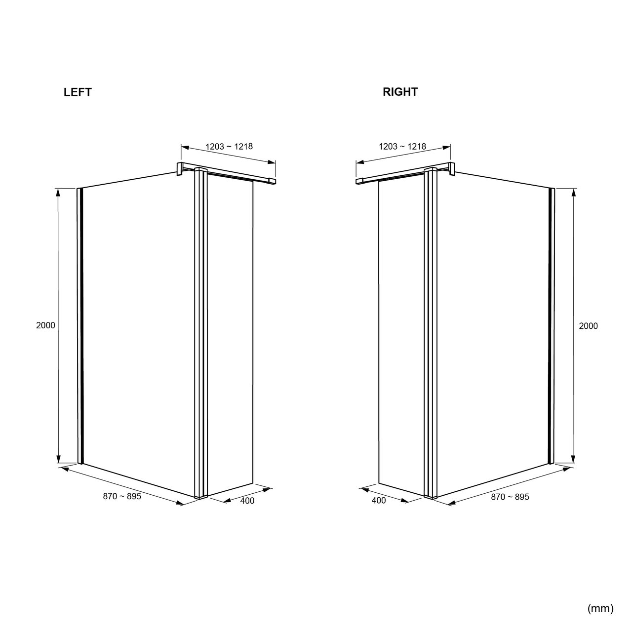 Diese Walk-In-Dusche ist 90 cm lang und 200 cm hoch und hat eine 40 cm breite Seitenwand. Die maximale Tiefe beträgt 120 cm.