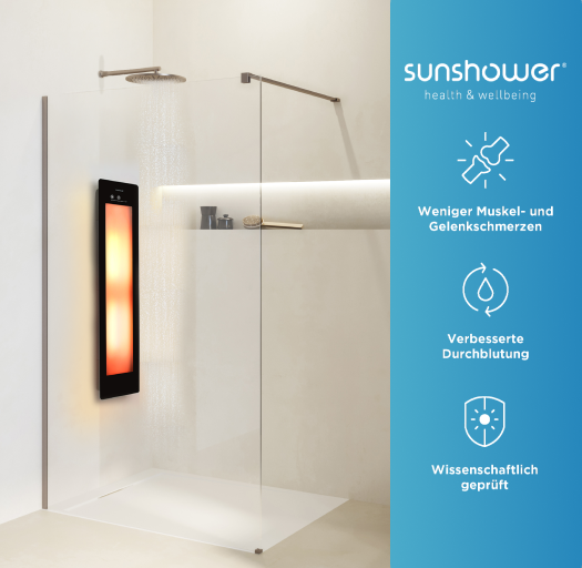 Eine Sunshower ist eine luxuriöse Ergänzung zu deiner Dusche und sehr beliebt! Eine Sunshower strahlt wärmendes Infrarot- und/oder niedrig dosiertes UV-Licht ab, was unter anderem gut für deine Muskeln und Durchblutung ist. Aber das ist nicht alles! Eine Sunshower bietet noch viele weitere Vorteile...