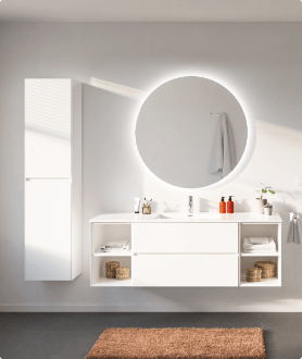 ✔ Minimalistisches Design – Klare Schränke und intelligente Stauraumlösungen halten das Badezimmer aufgeräumt und luftig.