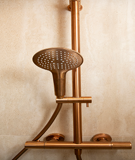 Ein Badezimmer, in dem marokkanische Einflüsse und Boutiquehotel-Flair harmonisch verschmelzen. Die Mischung aus tiefen Erdtönen, warmem Licht und natürlichen Materialien schafft eine intime Atmosphäre voller Luxus. Reiche Texturen wie Marmor, Nussbaumholz und Messing verleihen dem Raum das Gefühl eines Boutiquehotels – direkt in den eigenen vier Wänden.