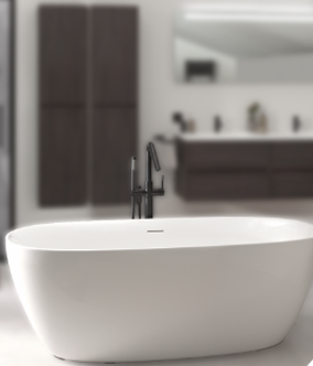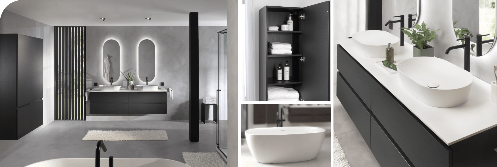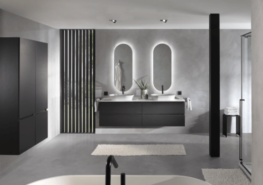 Ein Badezimmer mit zeitloser Eleganz, in dem Design und Luxus aufeinandertreffen. Die tiefen Schwarztöne, klaren Linien und hochwertigen Materialien verleihen diesem Raum einen exklusiven Charakter. Ein Ort der Entspannung mit dem Gefühl eines Fünf-Sterne-Hotels – direkt bei dir zuhause.